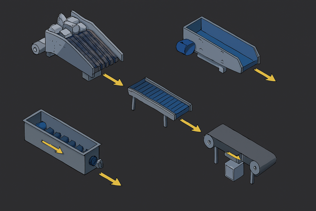 • دانه‌بندی: مواد درشت به جداسازی پیشین نیاز دارند؛ مواد پودری با اسکرو و ویبره بهتر کنترل می‌شوند.